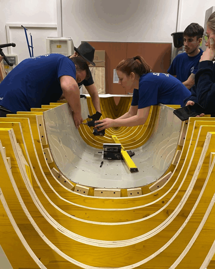 A hajótest zsaluzatának vázát adó háromrétegű fenyő zsaluhéjat lézergravírozták, így könnyedén tudták kivágni az egyedi vázelemeket. A megfelelő rögzítés után pedig az egyedi zsaluelemek fa tartószerkezeti vázát SF Flex műanyag zsaluhéjjal borították, amely kitűnően alkalmas a rendkívül kis hajlítási sugarak kialakítására és így az egyedi betonelemek finom formálására.